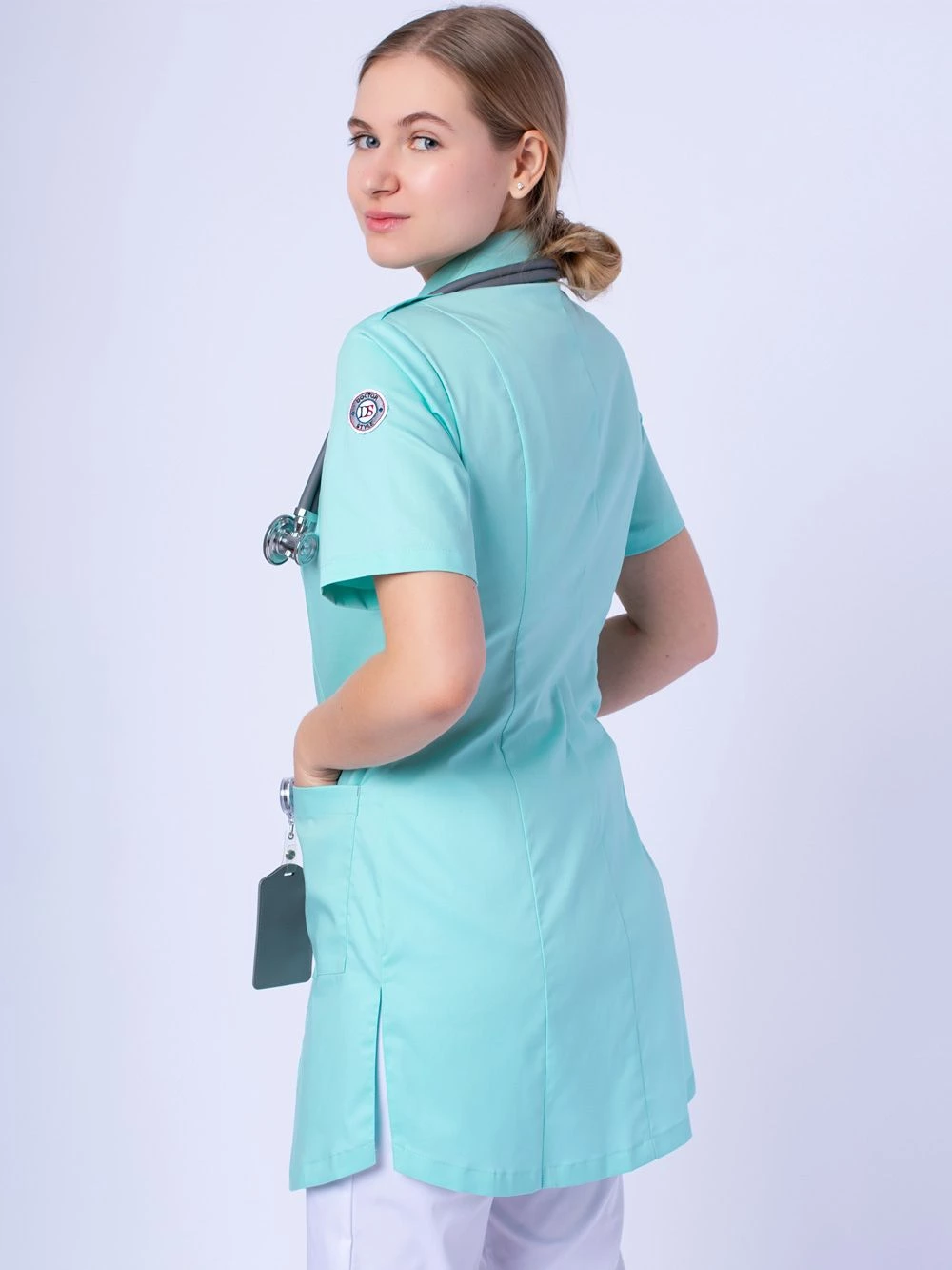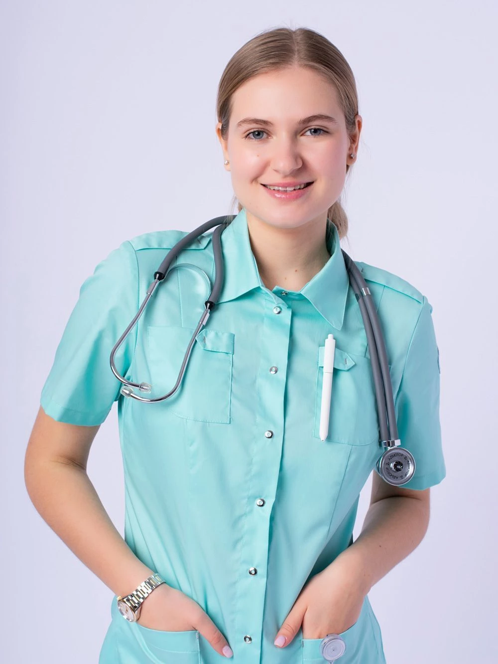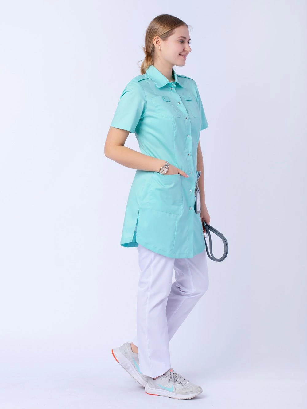 Универсальный комплект профессионального хирурга – блуза, брюки. Покрой свободный. Прямая блуза без пояса и без застёжки, рукава до локтей. У горловины вырез треугольный. Есть пара больших боковых накладных карманов и один накладной на груди. Брючины прямые, пояс брюк на резинке.