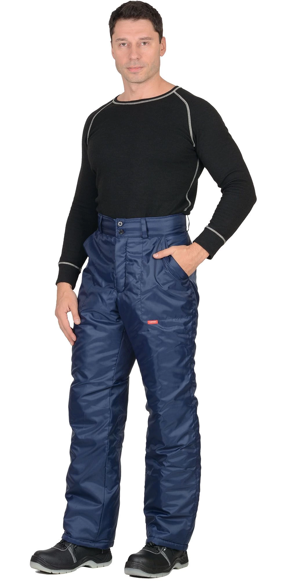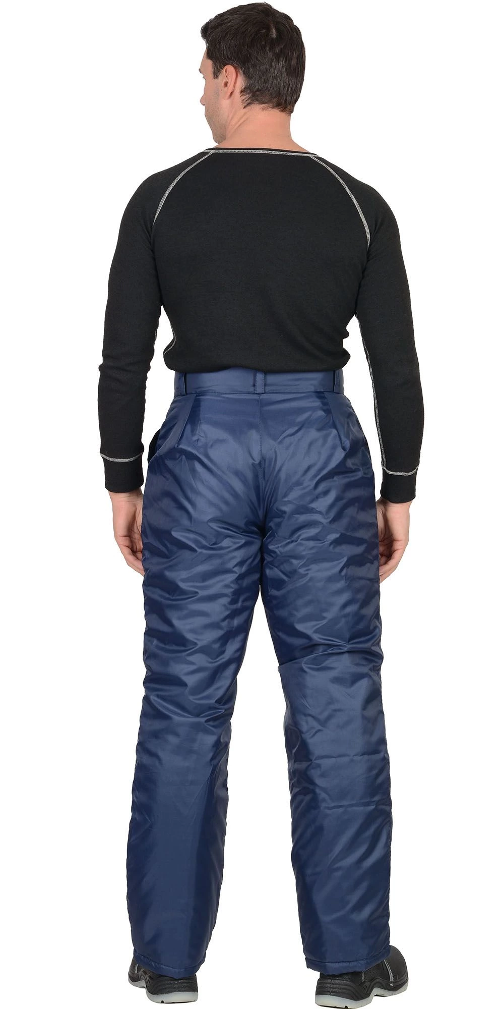 Брюки прямые, с притачной утеплённой подкладкой, с центральной застежкой гульфика на тесьму - «молния», широким поясом, с застежкой на две обметанные петли и пуговицы, пятью шлёвками: две на передней, и три на задней части пояса; с боковыми накладными карманами с наклонным входом.