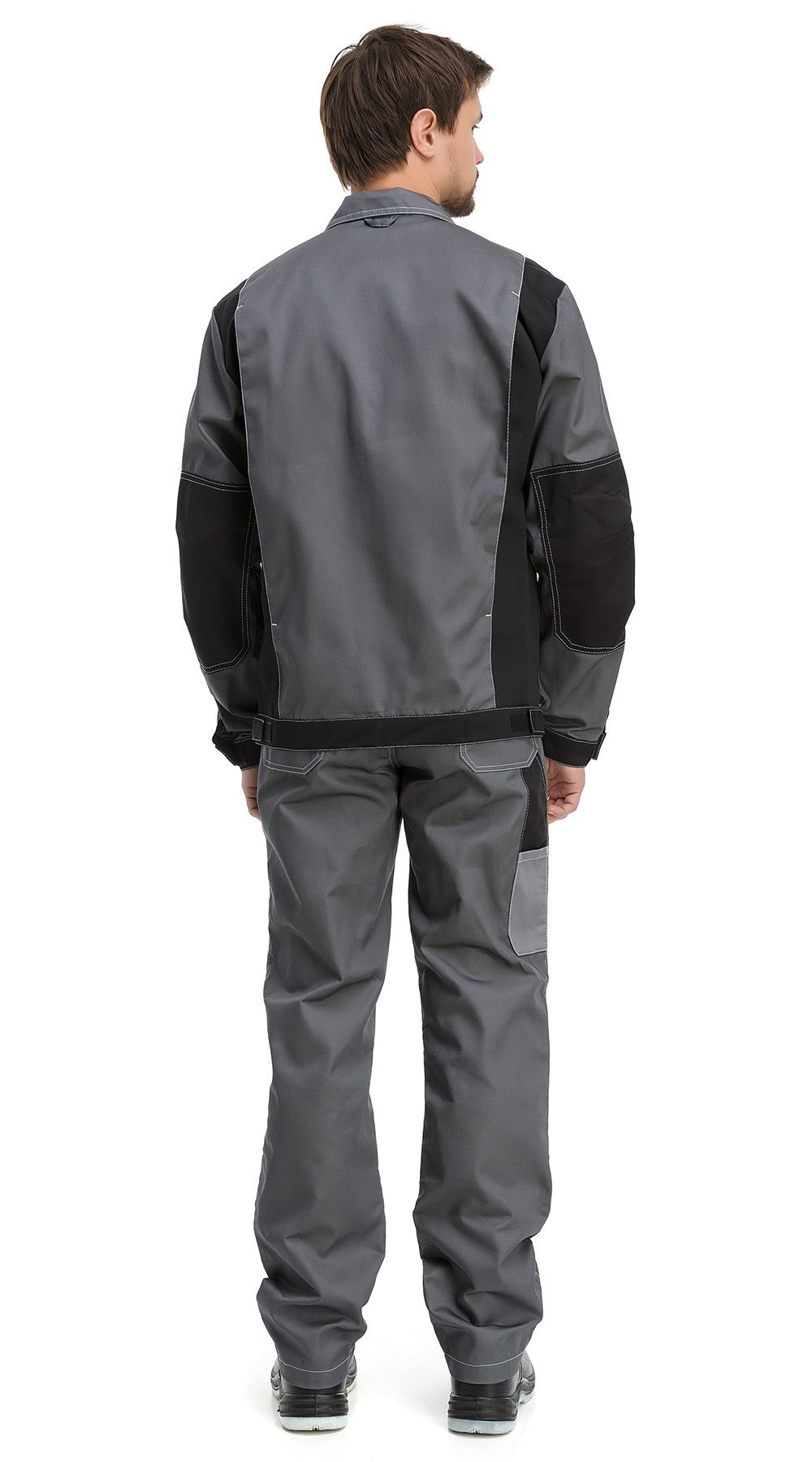 Мужской костюм состоит из куртки и брюк. Спинка и перед куртки снабжены кокеткой, отделанной материалом контрастного цвета. Застёжка на пяти пуговицах расположена по центру. Воротник – отложной. На передней части куртки имеются накладные карманы, из них один – на груди (есть отстрочка, куда можно вставлять ручки или карандаши), два других – боковые. Рукава снабжены манжетами и налокотниками, пуговичной застёжкой. Брюки – прямые, с пришитым поясом и пуговичной застёжкой. Оснащены наколенниками и парой накладных косых карманов.