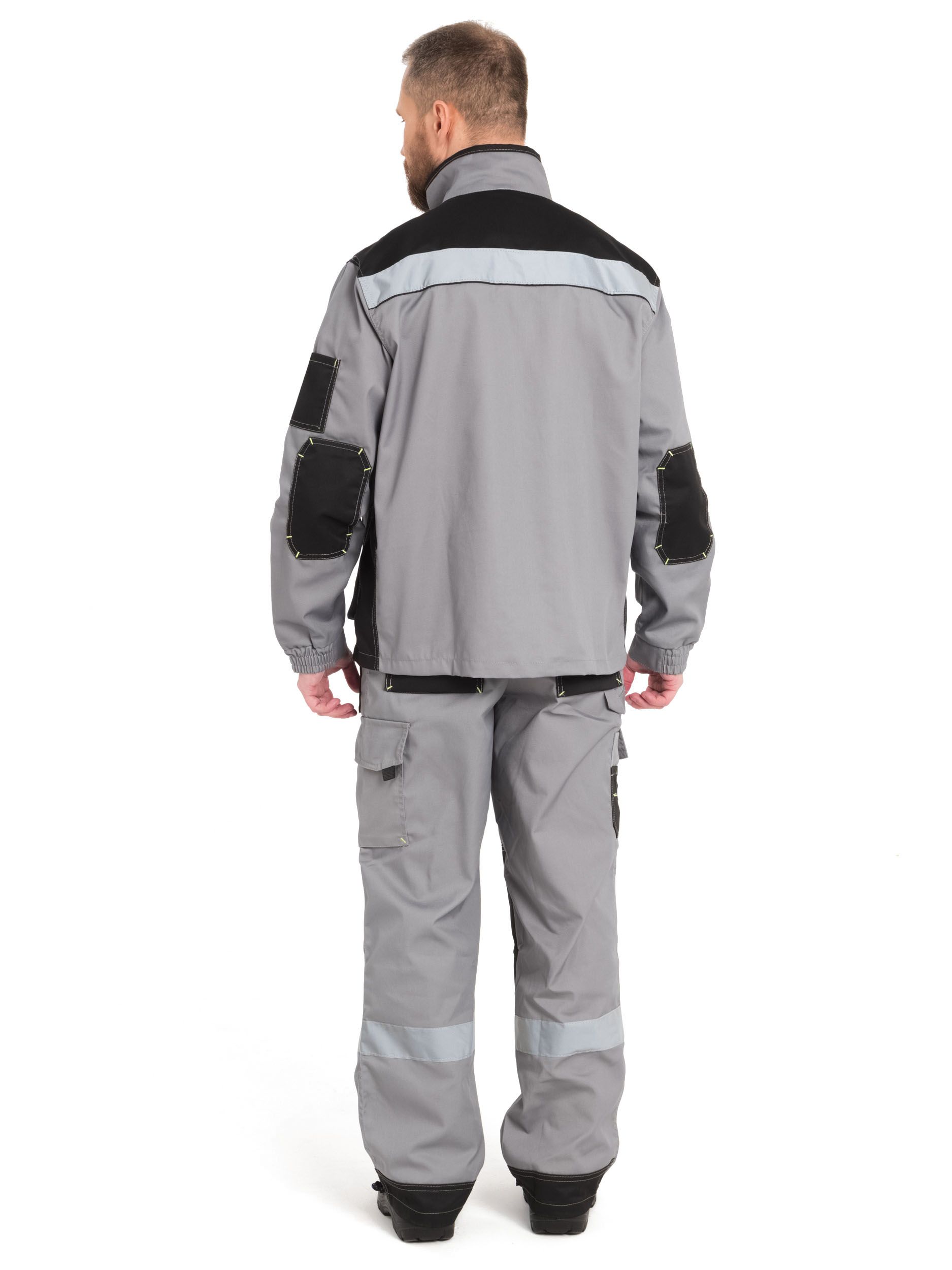 Куртка: четыре кармана для инструментов, отложной воротник, притачной пояс стянут по бокам эластичной тесьмой, по кокетке спинки, полочки и низу брюк - лента СОП 50 мм. Полукомбинезон: передняя застежка на пуговицы, застежка в боковом шве на пуговицы, бретели с фастексами, накладные карманы, по низу световозвращающая полоса СОП 50 мм.